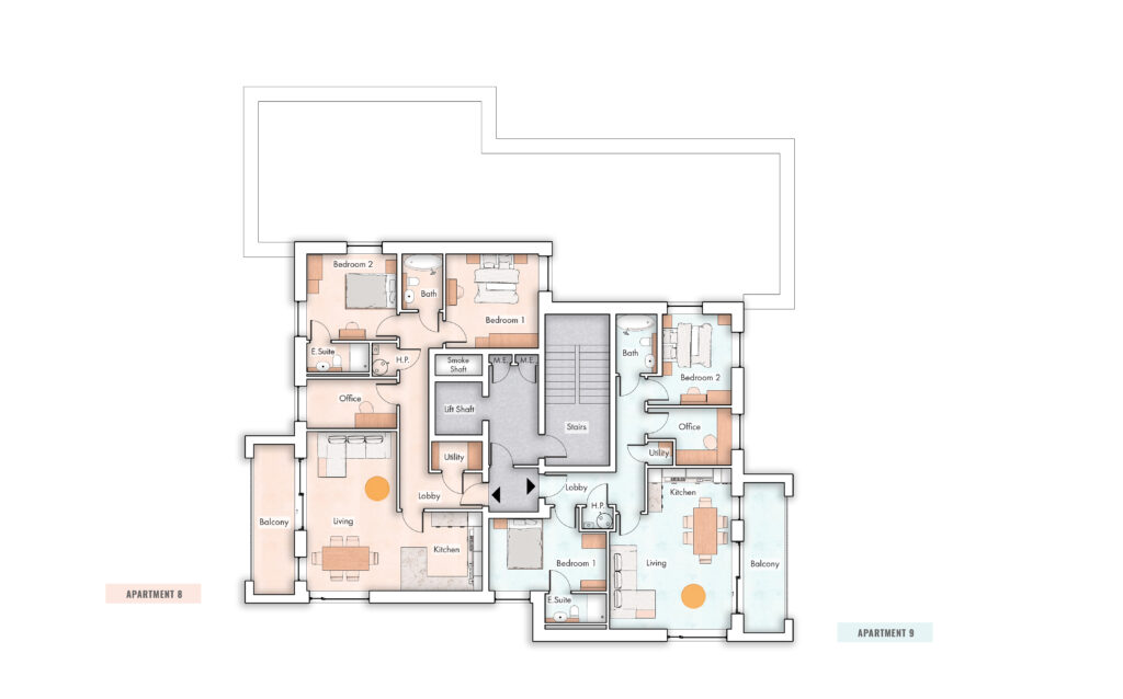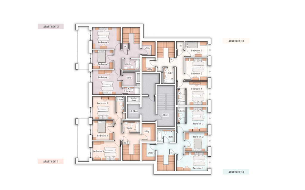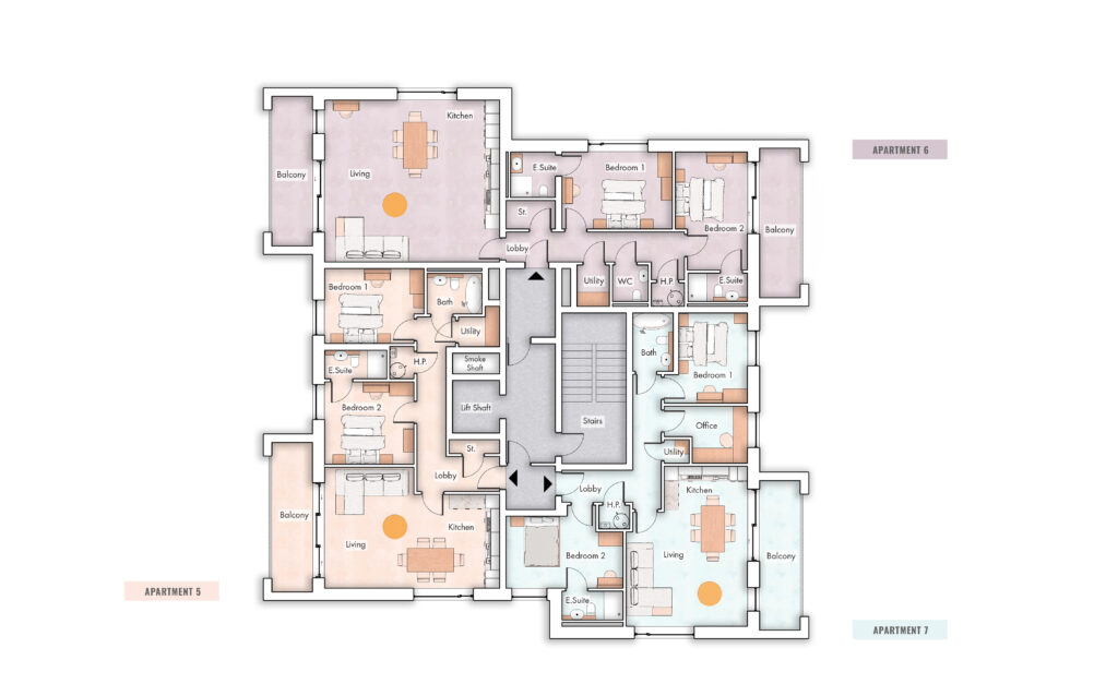 Each apartments enjoys different aspects, floor areas and individual kitchen layouts and designs –